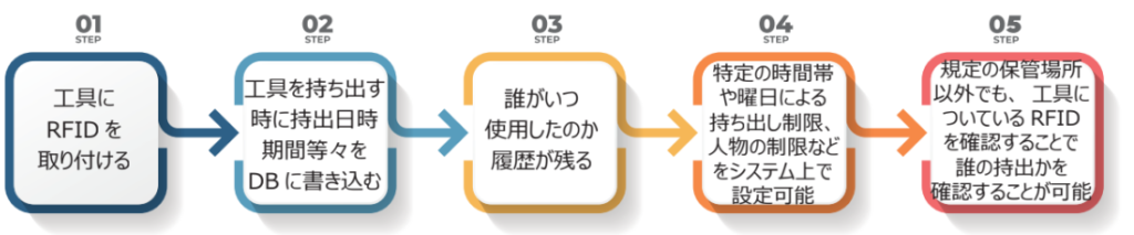 工具それぞれにRFIDタグを取り付け、持ち出し・返却時に専用のリーダーで読み取れば、「誰が、いつ、どの工具を持ち出したか」が自動で記録されます。これにより、手書きの台帳記入が不要になる上、リアルタイム且つ正確な持ち出し管理が可能となります。