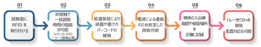 バーコードは結露や霜に非常に弱く、正しく読み取れなくなるケースもあります。一方、RFIDタグは電波で通信するため、冷凍庫内や結露が発生しやすい低温環境でも安定した読み取りが可能です。検体を常温に戻すことなく管理できるため、検体の品質保持にも貢献します。